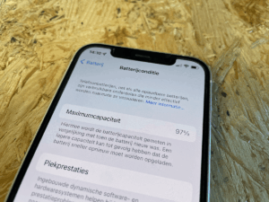 Ga op de iPhone naar ‘Instellingen’, klik dan op ‘Batterij’ en ‘Conditie van batterij’. Daar staat een percentage. Is die 100%? Gefeliciteerd, niks aan de hand. Van 100 tot 80 procent hoef je je geen zorgen te maken want dan blijft je telefoon het waarschijnlijk als vanouds doen. Komt de conditie ónder de 80% dan wordt het tijd om de batterij te vervangen. En nee, dat doe je natuurlijk niet zelf, dat kun je het beste laten doen door een onafhankelijke reparatie provider, wij dus. Staat de batterijconditie op 85% en merk je toch dat de batterij snel leeg raakt, kijk dan bij de instellingen of je iPhone ‘normale piekbelasting’ ondersteunt. Dat zie je in hetzelfde scherm als waar je de batterijconditie checkt. Wordt het niet ondersteund, dan is je batterij zeker aan vervanging toe, om te kunnen blijven profiteren van maximale prestaties.